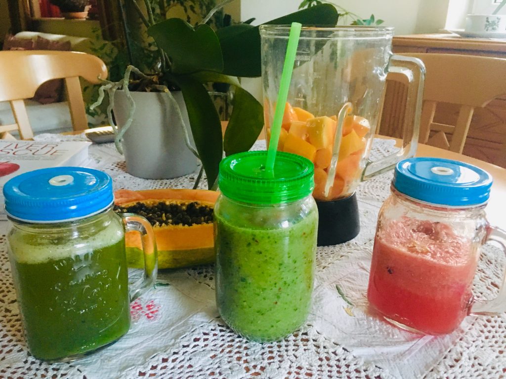 Bei der Kur ging es darum, meine Leber von Toxinen, Viren und Pathogenen zu befreien. Kurz gesagt, die ersten Tage ein moderater Essensplan, jedoch glutenfrei und vegan und die weiteren 6 Tage zusätzlich ohne Fett nach einem bestimmten Plan. An 2 Tagen war der Essensplan Mittags und Abends grüner Spargel mit Rosenkohl. Dazu mußte ich extra nach Berlin fahren, weil es hier in Potsdam noch keinen grünen Spargel gab. Ok, was tut man nicht alles…… Der letzte Tag war ein Smoothie-Tag, wo man morgens Zitronenwasser, Selleriesaft und tagsüber Apfel/Gurkensmoothie sowie Früchtesmoothies trinken durfte. Ich kaufte mir eine große Papaya, eine reife Mango und Wassermelonen und pürierte sie im Mixer zu leckeren Smoothies.